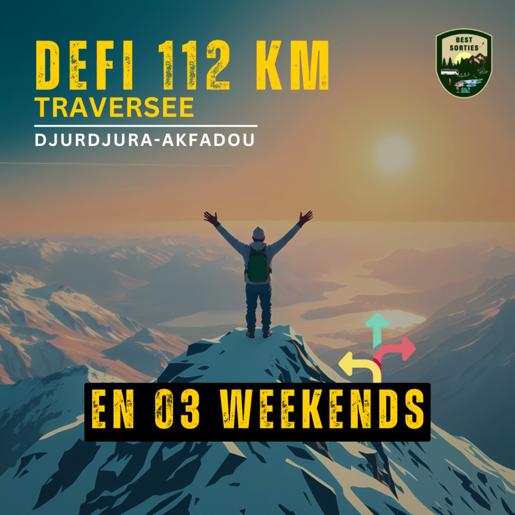DEFI-RANDO TRAVERSEE DJURDJURA-AKFADOU 112 km en 03 WEEKENDS (06 journées)🔴🔴 (NOUVEAU CONCEPT) CHAQUE VENDREDI & SAMEDI DE LA SEMAINE Best Sorties vous propose un nouveau DEFI d’accomplir 112 km en 03 weekends (soit 6 jours) chaque VENDREDI & SAMEDI de la semaine, avec un meilleure ambiance pour familiale entre randonneur… (LISEZ BIEN LES DETAILS DE L’ANNONCE) Destination : TRAVERSEE DJRUDJURA-AKFADOU Infos de la Destination : [VENDREDI 16/01] J01 (CIRCUIT 01): Traversée Col Tirourda 17km 🟠Tizi N’Kouilal- Forêt Ath Ouâbane- Col Tirourda. [SAMEDI 17/01] J02 (CIRCUIT 02): Traversée Col Tirourda- Col Chellata 17km 🟠Col Tirourda- Azro N’hour- Col Chellata. [VENDREDI 23/01] J03 (CIRCUIT 03): Traversée Col Chellata- Col Chréa 13km 🟠Col Chellata- Ath zikki- Col Chréa. [SAMEDI 24/01] J04 (CIRCUIT 04): Boucle Sommet Tamazguida- Akfadou 20km 🔴Col Chréa- Tamezguida- Col Akfadou- col Chréa. [VENDREDI 30/01] J05 (CIRCUIT 05): Traversée Col Akfadou- Mehagga 22km 🔴Col Akfadou- Lac TDA- Lac Urufel- Borne11- Mehagga. [SAMEDI 31/01] J06 (CIRCUIT 06): Traversée Mehagga- Adekar 23km 🔴Mehagga- Pont 9 mètres- Borne11- Borne08- Lac Noir- Adekar. Type de Sortie : TRAVERSEE But de la Sortie : Randonnée en haute montagne requiert de travailler l’endurance, de se préparer musculairement, et, bien sûr, d’acclimater à l’altitude. Niveau de difficulté : Chaque circuit est détaillé Distance de marche : 112 Km de marche Tarif : 💥Pack ALL (toutes les sorties) 12.000 da + 01 sortie gratuite (recommandé) 💥Pack HALF-PACK 3 randos au choix 6.000 da 💥Paiement par sortie 2500 da Le Tarif inclut : Guide et assistance durant la journée + Transport Aller-Retour + Assurance de Voyage + CARTE DU PACK CHOISIS OFFERTE Heure de départ : 6h30 Matin / H de Retour estimée : 20h00 Sur Alger Point de départ : Ruisseau, a coté du chemin de TRAM-WAY a coté du parking près de la station de métro (BEST SORTIES POINT DE DÉPART SUR GOOGLE MAPS) Équipement adéquat pour la randonnée :Chaussure de marche confortable + Vêtements larges + Casquette + Sac à dos A prévoir :Déjeuner a la charge du client (Soit vous ramenez avec vous ou bien durant le trajet on fera un arrêt de pause) Service OFFERT : Suivis de chaque randonneur (nombre de sorties et distance de marche effectuées chaque mois) ⚡JE RÉSERVE